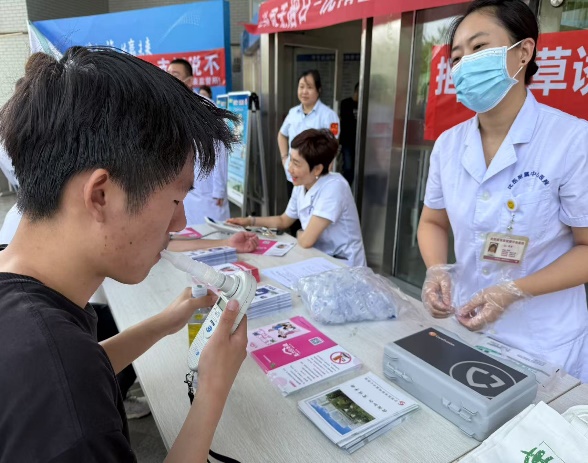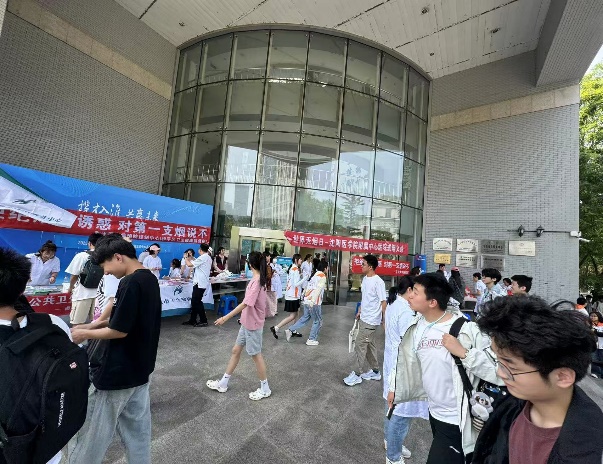 活动当日11:00 - 13:00,活动现场通过图文展板等形式,系统展示烟草对人体呼吸系统、心血管系统的危害,以及二手烟、电子烟的隐蔽威胁,吸引众多师生。同时,来自多家单位的医护人员开展健康公益义诊,为师生提供血压血糖检测、肺功能简易筛查等服务,结合检测结果针对性讲解吸烟与疾病的关联,并发放《无烟生活指南》等宣传手册300余份。此外,互动问答等环节,进一步增强师生参与感。